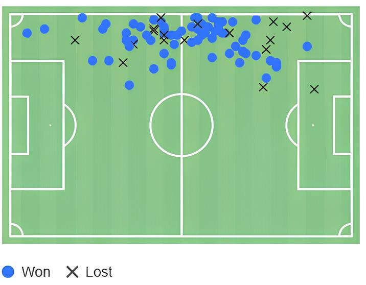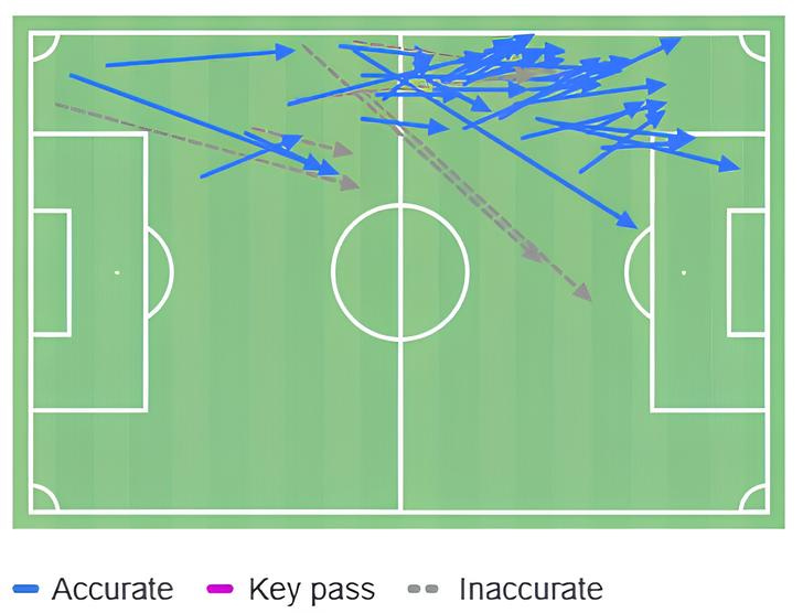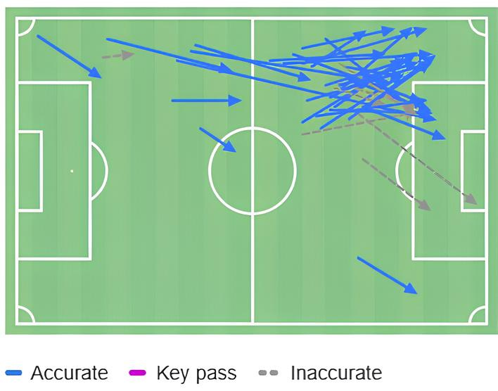 We have a relatively recent game with which to provide simple comparison, the 1-1 result versus St. Mirren from May 17, 2025. The first image is the passes received during that game for Greg Taylor.