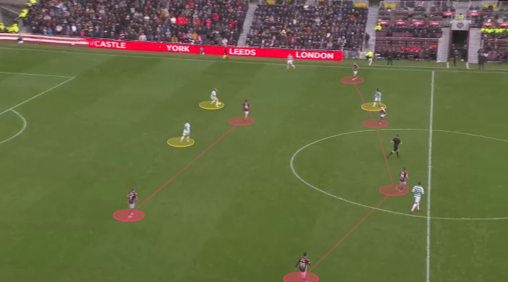 We started our journey with Liam Scales on the ball with Callum McGregor inside and Reo Hatate directly ahead. Note the front six of Hearts were pretty well positioned within their 4-4-2 shape. McGregor’s on-again-off-again marker, Claudio Braga, was pulled towards Scales on the ball.