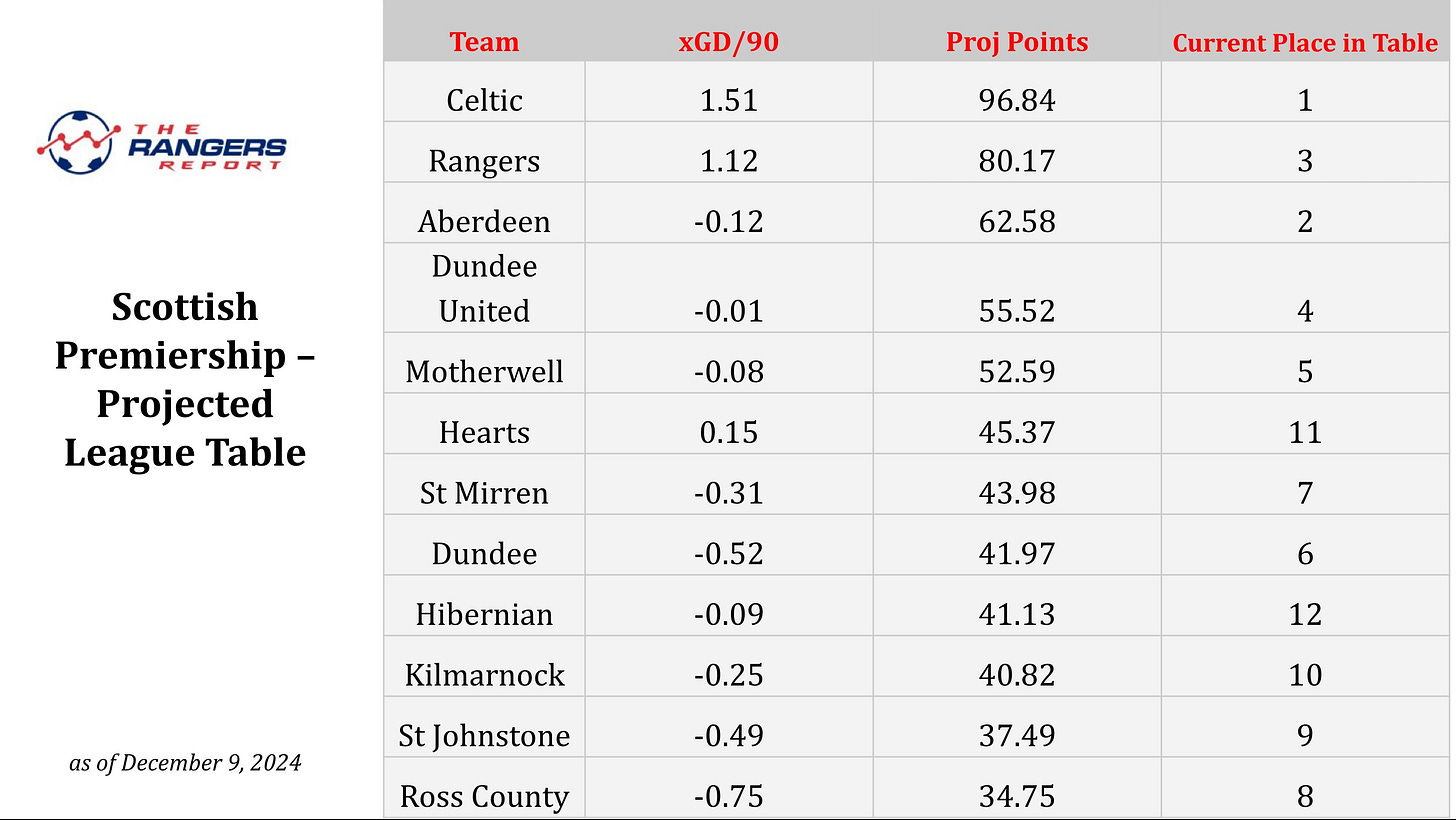 Firstly, the admirable X account @TheGersReport continues to produce his projected league table. This uses performance metrics to date to project forward the rest of the campaign via simulation.