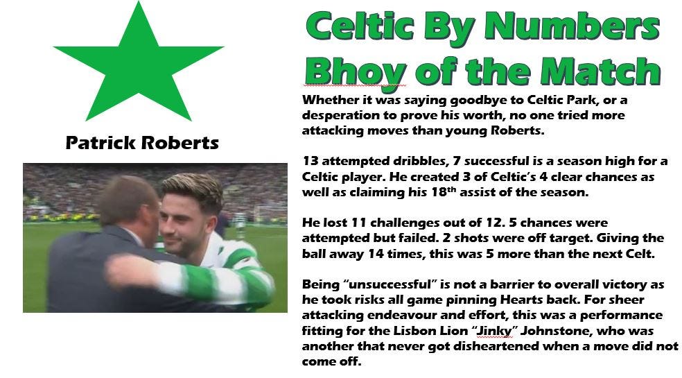 The final league game of the season had plenty at stake for Celtic with modern invincibility in sight. Celtic once lost a single league game and still finished second, under Tommy Burns, but there was to be no such heartache this season. Commendably Hearts showed signs of improvement under new coach Cathro, defending deep and in numbers to frustrate a circumspect but determined home side. Once the opener went in, it wasn’t until a flurry of corners and chances at the end when the Edinburgh side threatened.