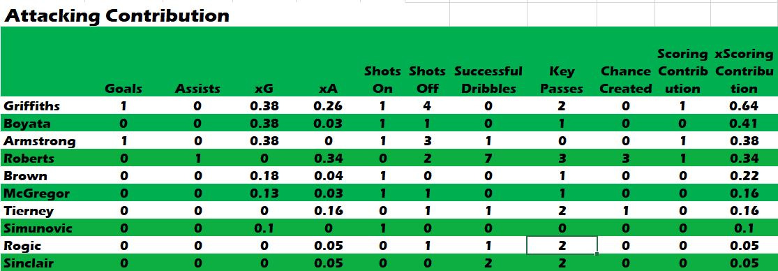 The negative was that Armstrong became marginalised. With Brown (55 passes) and McGregor (53) dominating central midfield, and Rogic (23 passes) linking from the “10” position, Armstrong struggled to get into the game and completed 12 passes. He did, of course, seal the invincible season with the 2nd goal – you can’t keep a good hairstyle down!