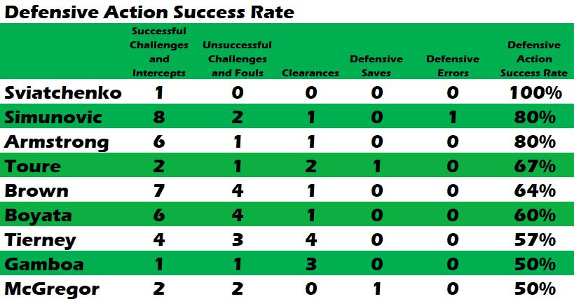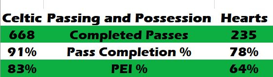 Tellingly, the two full backs, Gamboa and Tierney, had very high pass completion - Gamboa 90% and Tierney an uncharacteristic 92%. They average 87% and 82% respectively. Whilst it surprises me that Gamboa does not trust his pace to beat players more (only completed 4 dribbles in 1345 mins all season), Tierney usually bombs on. Therefore, their relative circumspection (Tierney did create 1 chance and attempted 2 more – his break pedal only works so far) was indicative of Celtic keeping their defensive shape. Tierney has only surpassed his pass completion % in the home game vs Aberdeen (4-1).