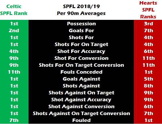 So scoring is an issue for Hearts and unfortunately for them they are up against the best defence in the SPFL. Conceding 0.53 per game, Celtic give up the least shots, and the opposition only convert 8% of them.