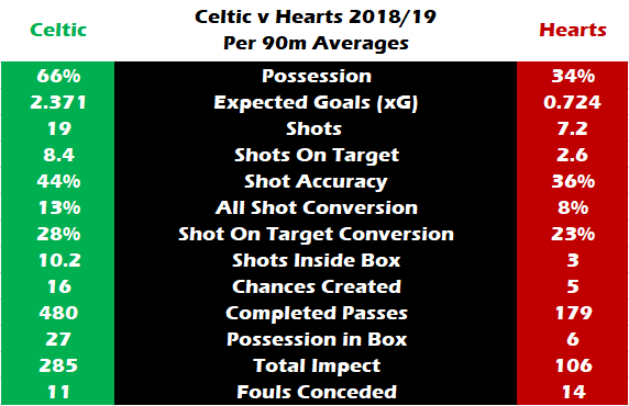For the Champions, if they hit their averages of creating 16 chances and having nearly 20 shots, an xG of 2.371 suggests victory given Hearts would then need to score 3 off a xG of 0.724.
