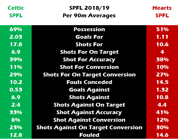 Celtic managed just over 2 goals per match whilst Hearts averaged 1.11.