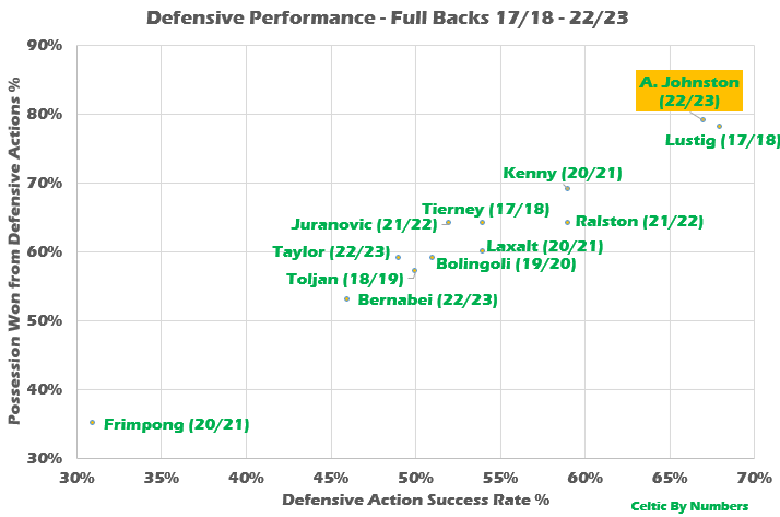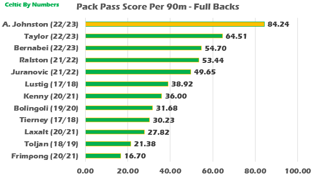 Johnston, then, is an elite level amongst Celtic’s recent full backs in pack passing, and highly competent on getting on the end of forward passes as well.