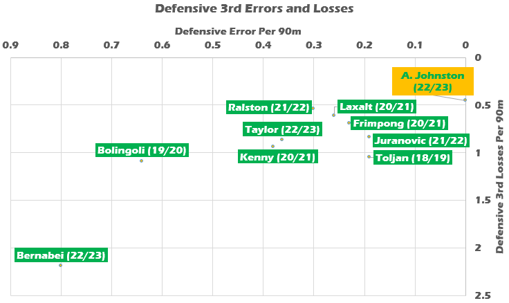 Anthony Ralston has the lowest differential between recoveries and turnovers and Johnston is not far behind. This is very much Bernabei’s key weakness (and consider the possibility of a “toxic combination” left side of Bernabei, Carl Starfelt and Reo Hatate in this regard).