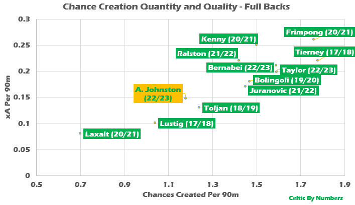 In terms of pure chance creation considering volume (number of chances created) and quality (expected assist value of chances created), Johnston rates quite lowly in comparison to recent full backs – again more like Lustig than Tierney.