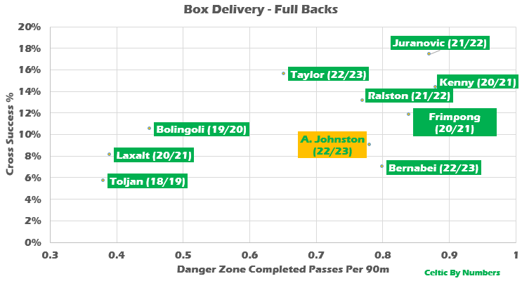 One of Josip Juranovic’s strengths was the accuracy of his crossing into the box and Johnston’s cross success rate is around half of that.