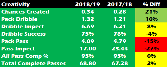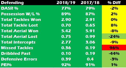There is no great improvement or regression on any of the key defensive actions save for Missed Tackles which was 0.19 per 90m in 17/18 but is 0.36 per 90m.