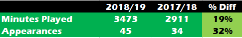 19 SPFL appearances in 17/18 was increased to 23 in 18/19. Overall his appearance report card: