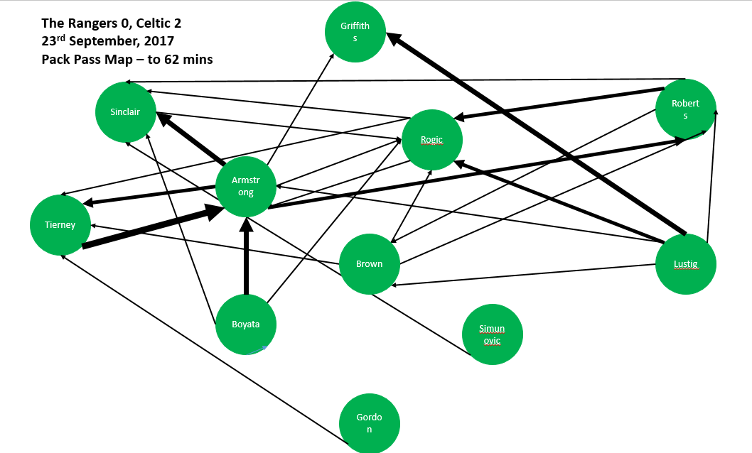The following maps ONLY passes that took out at least one opponent (a “pack” pass) and not ALL passes. Therefore it illustrates the materially significant relationships, where Celtic were able to outmanoeuvre the opposition. Also, it only contains passes amongst the starting XI and therefore goes up to the 62nd minute.