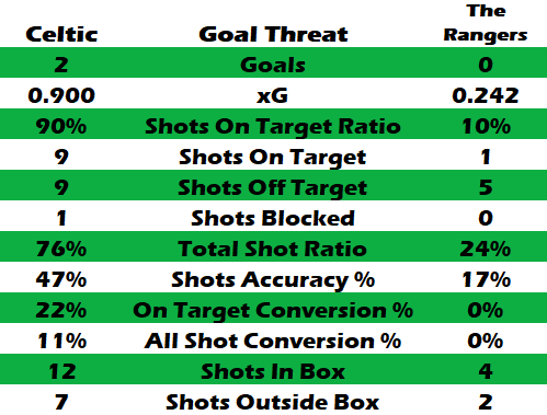 With 19 shots to 6 Celtic dominated the shootout, although many of their chances were from distance (7 out of 19 efforts outside the box) hence an xG of 0.9. The Rangers one shot on target was from within the 6 yard box, hence the xG of 0.242.