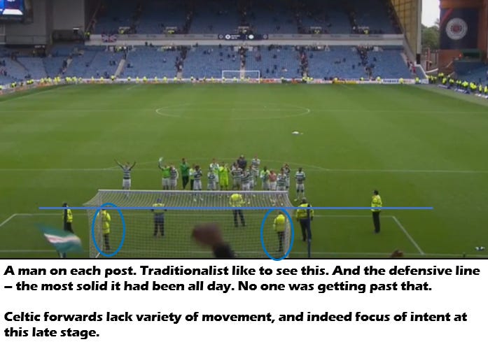 This period culminated in the goal which was rare in that scoring from a secondary phase after a corner is difficult. This is due to the number of opponents in defensive formation, and the risk to the attackers of the counter once the defending team pushes up to chase any clearance. That is, both teams’ players are likely running away from the goal the corner came from. However, defensive errors against a Celtic side with goals across the front five, will often be punished.
