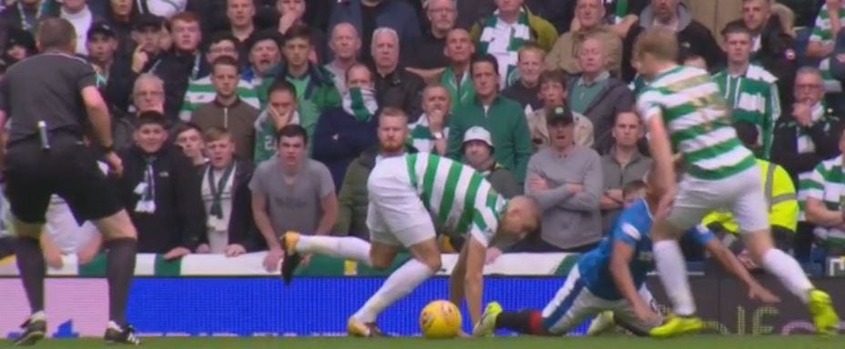 There was one moment of jeopardy for the Champions. Morelos went over in the box, his leg landing on Simunovic whom he hurdled over. It was one of these where the initial miss control from Morelos tempted Simunovic towards a challenge. Morelos gets to the ball first, and Simunovic withdraws from the challenge. In real-time, it looks from the referee’s angle that Simunovic may have got a touch on the ball and this may have influenced him. But it was Morelos’s touch. Morelos hurdles over Simunovic and puts his leg down mid-air catching the Bosnian’s knee. The fall is a little exaggerated. The referee has an excellent view. Having said that, I was stunned Thomson did not elect to give a penalty.