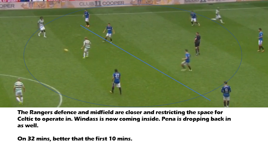 Celtic did not score in this period, and the home side’s defensive organisation improved for the rest of the half. They improved the spacing between defence and midfield, squeezing the defence up to become more compact as a unit.