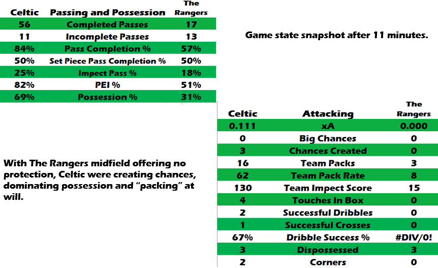 Celtic’s ability to have runners lose their man markers, to play accurate passes through the lines, and the Light Blues apparent lack of defensive organisation, had Celtic, by the numbers at least, heavily dominant after 11 minutes as this snap shot shows.