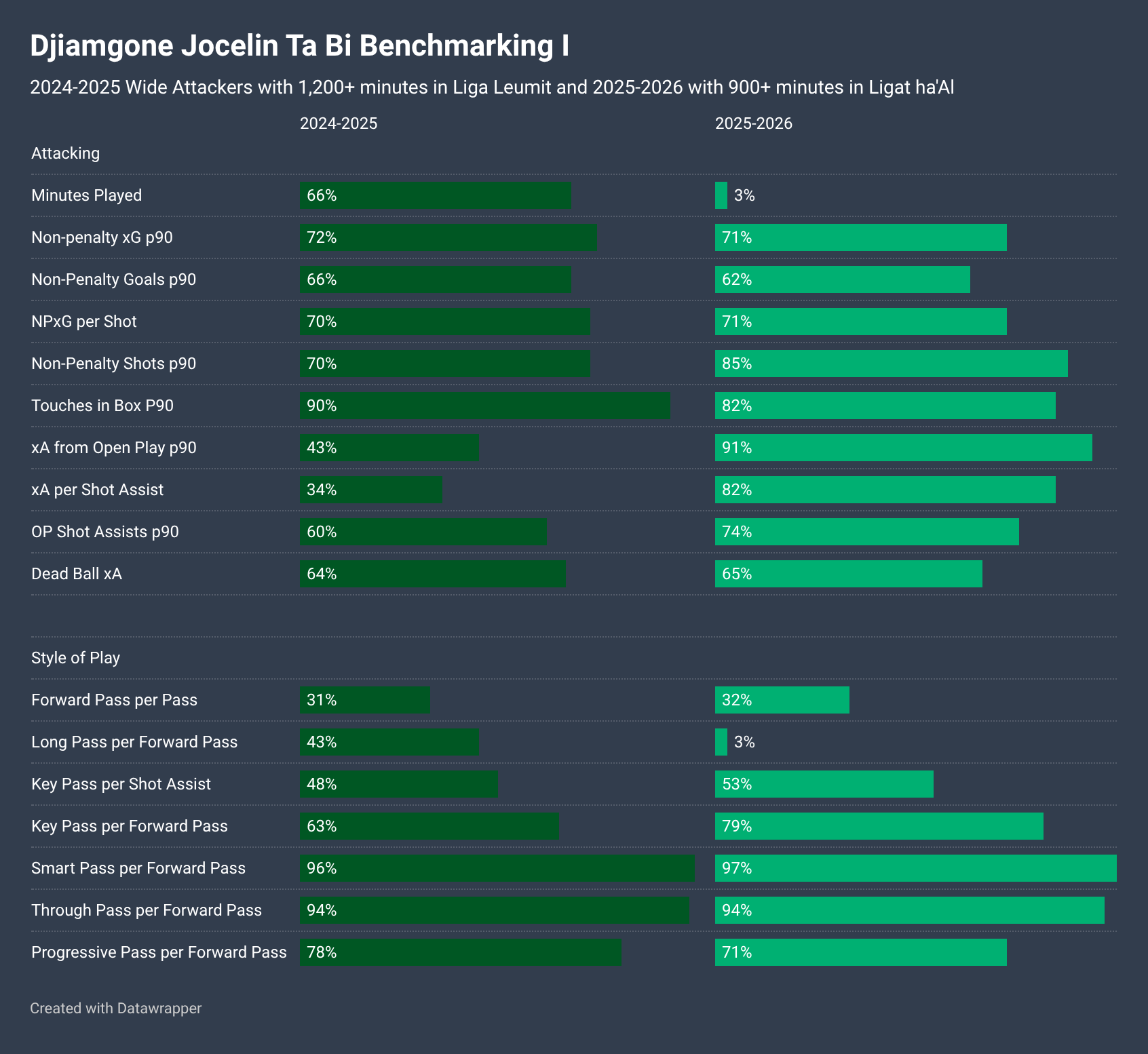 As usual, first some context on the two seasons in question. He played both at Hapoel Petah Tikva, with 2024-2025 in the Israeli second division, and then 2025-2026 so far in the top flight with the team earning promotion. He’s being deployed mostly as a wide attacker from the right with a lot of what appears 4-2-3-1 and close variants.