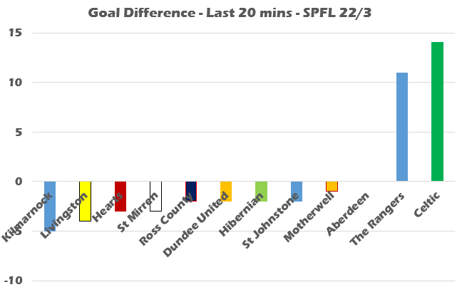 Celtic are +14 on goal difference in the last 20 minutes, scoring 17 and conceding just three. Their Glasgow rivals are 14-3 in this period.
