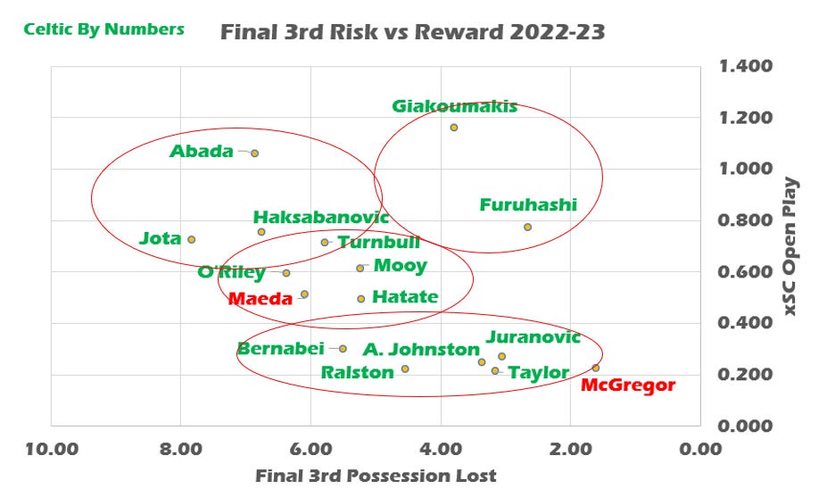 Finally, the outliers. Callum McGregor has the lowest xSC and lowest final third loss numbers. His role is specific to anchoring the midfield and even more so under Ange Postecoglou.
