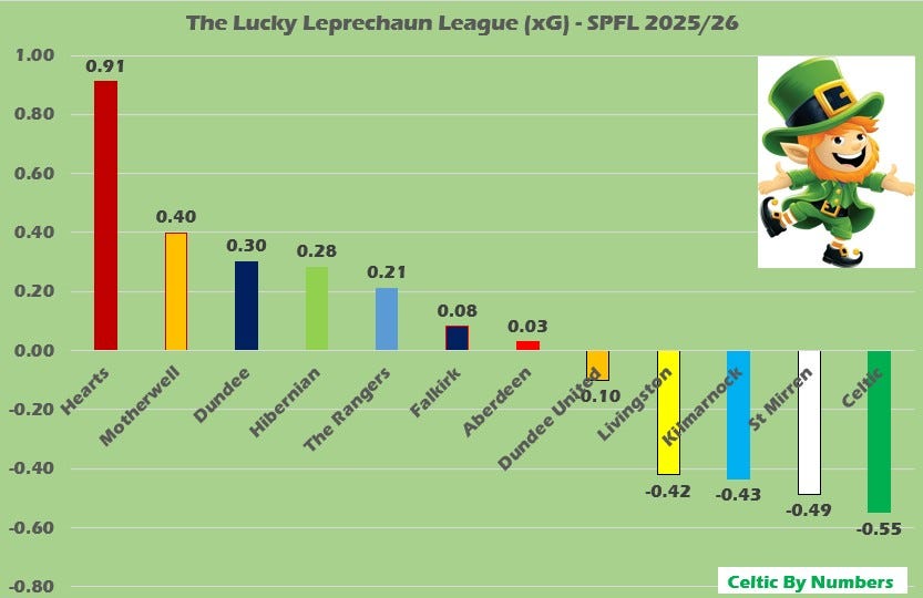 But McInnes’s Hearts are skying the park on that one. By nearly 1 whole xG per game in their favour. Add in the team underperforming at both ends to the greatest degree is Celtic, by -0.55 xG per game, that is 1.5 xG per game in Hearts favour from finishing and keeper play.