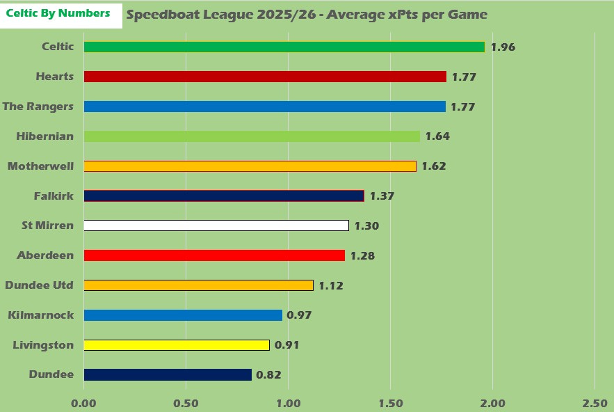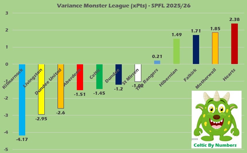 So, as well as benefitting from nearly 1 xG per game and 1.5 xG over their rivals per game, Hearts have so far benefitted by 2.38 expected points from the cumulative impact of penalties, own goals and red cards.