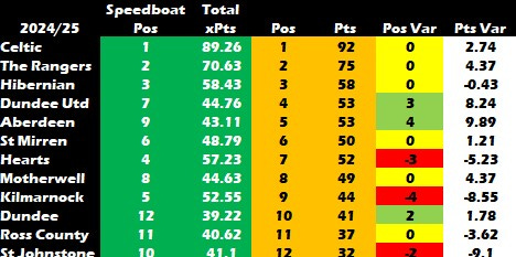 Aberdeen and Dundee United were the main overperformers, with the Dons being flagged from an early point in the season whereby their opening unbeaten run could not be supported by the underlying numbers.