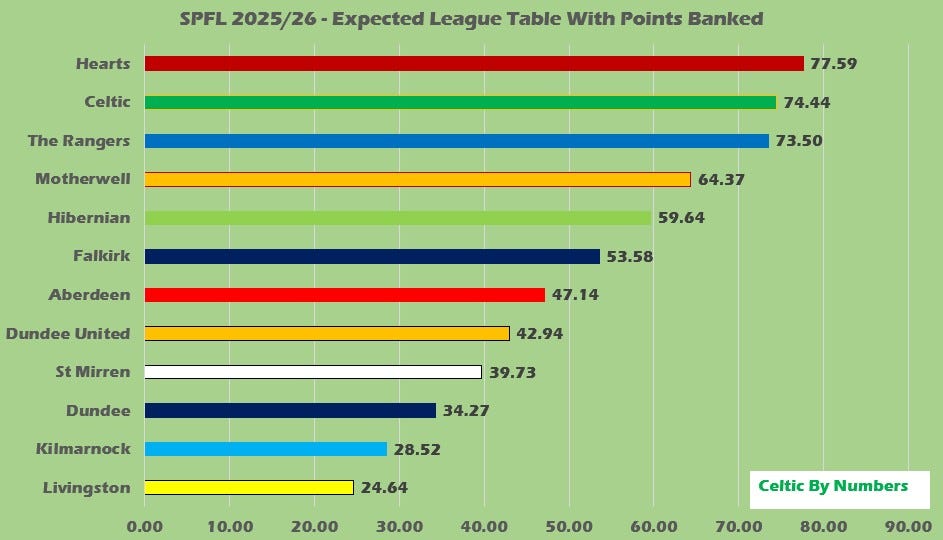 Following the draw at the weekend, Hearts have increased their expected lead over Celtic and are now over three points ahead by final projections. Given there were no discrepancies more than nine points last season, that is already looking like a promising position for the Jambos.