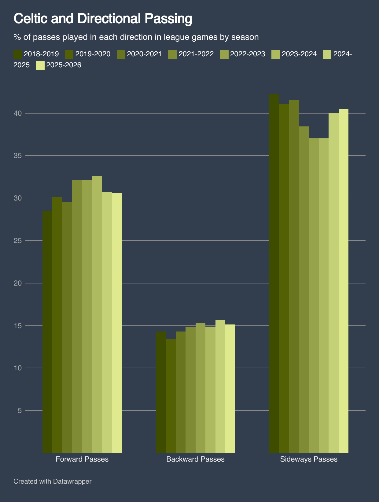 While possession has remained dominant so far this season at around 70%, the warning signs were present last season regarding systemic factors, in my opinion. While the first season in Rodgers 2.0 continued the directional trend towards more forward passing that occurred under Ange, 2024-2025 and the current season have seen a reversal.