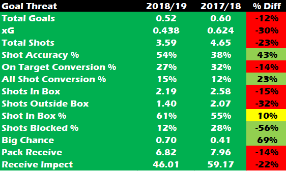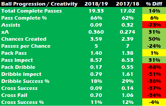 The frustration for Celtic and Griffiths is that in a season of such disruption, he still manages to achieve over a goal every other game with 0.52 goals per 90m. Of course, this is a decrease on the norm and an over achievement against xG, but still. Otherwise, within the Red Sea, shots are down. Strangely, shot selection seems to have undergone a huge uptick. More shots inside the box, less shots blocked and massively improved shot accuracy the consequence. An older, wiser Griffiths? He even had significantly more Big Chances, reflecting the ability to get into the Danger Zone. Overall Receive Packing was down though, indicating less movement and control of forward passes. Being optimistic, there are some encouraging signs of more effective striking!