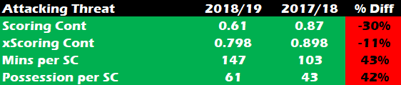 No surprises that his overall Scoring Contribution rates were well down. And he was contributing from far more possessions and minutes played. Tellingly his xSC was down the least – funny how you don’t get what you deserve when you need it most!