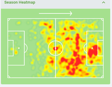 His season heatmap shows a greater preponderance to be central to the goal. And also, how he drops into that 30 yard from goal zone to fight for the ball and link up.