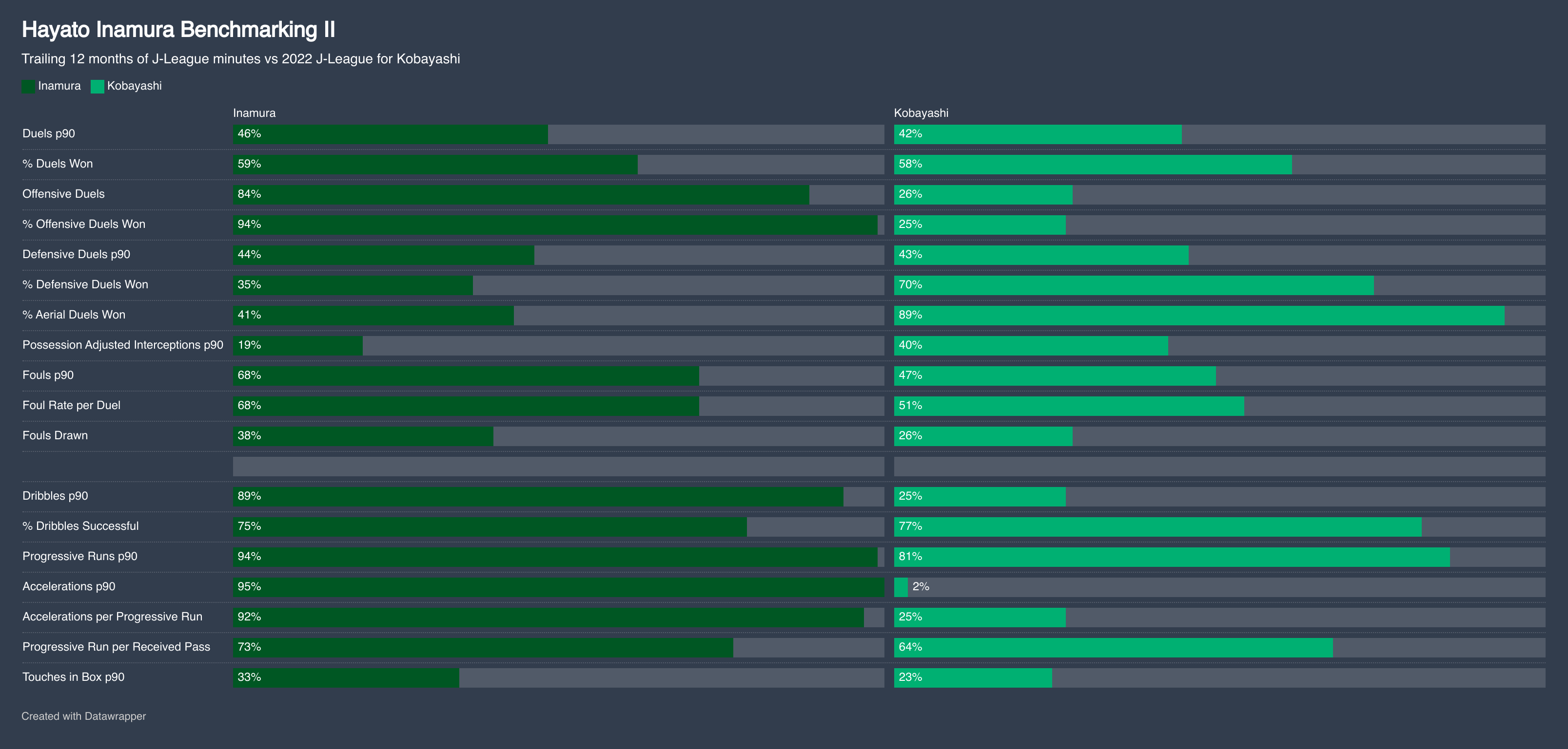 That was the section within the benchmarking exercise in which I looked at his data for duels, as well as running and dribbling with possession of the ball. His public data from the J-League indicated a top sprint speed comparable to what Alistair Johnston has posted in recent Champions League games, which was about 34 km/h.