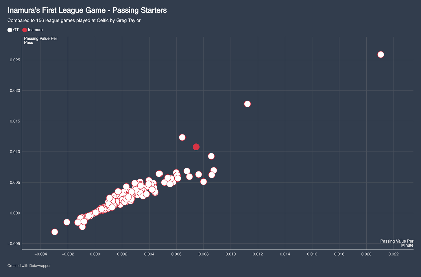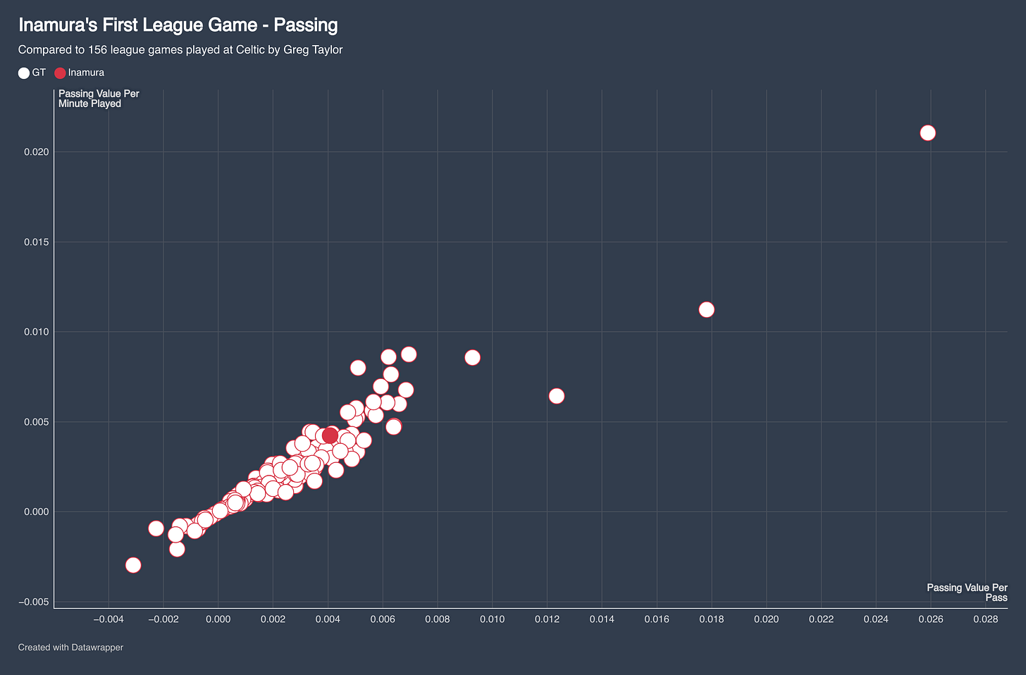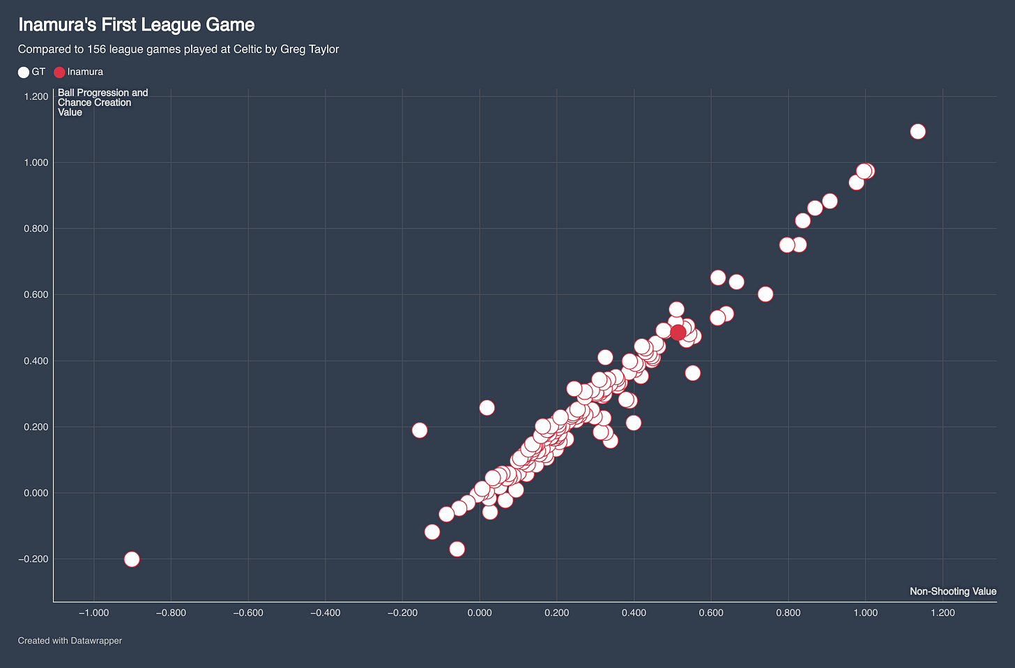 This image shows a scatter plot of all 156 league games in which Greg Taylor played at Celtic, with possession value metrics combined to produce two variations labeled as the X and Y axis. The X-axis includes defensive actions, while the Y-axis excludes those - hence the strong positive correlation. In addition, neither include any shooting-related metrics. Inamura’s performance was shown in red.