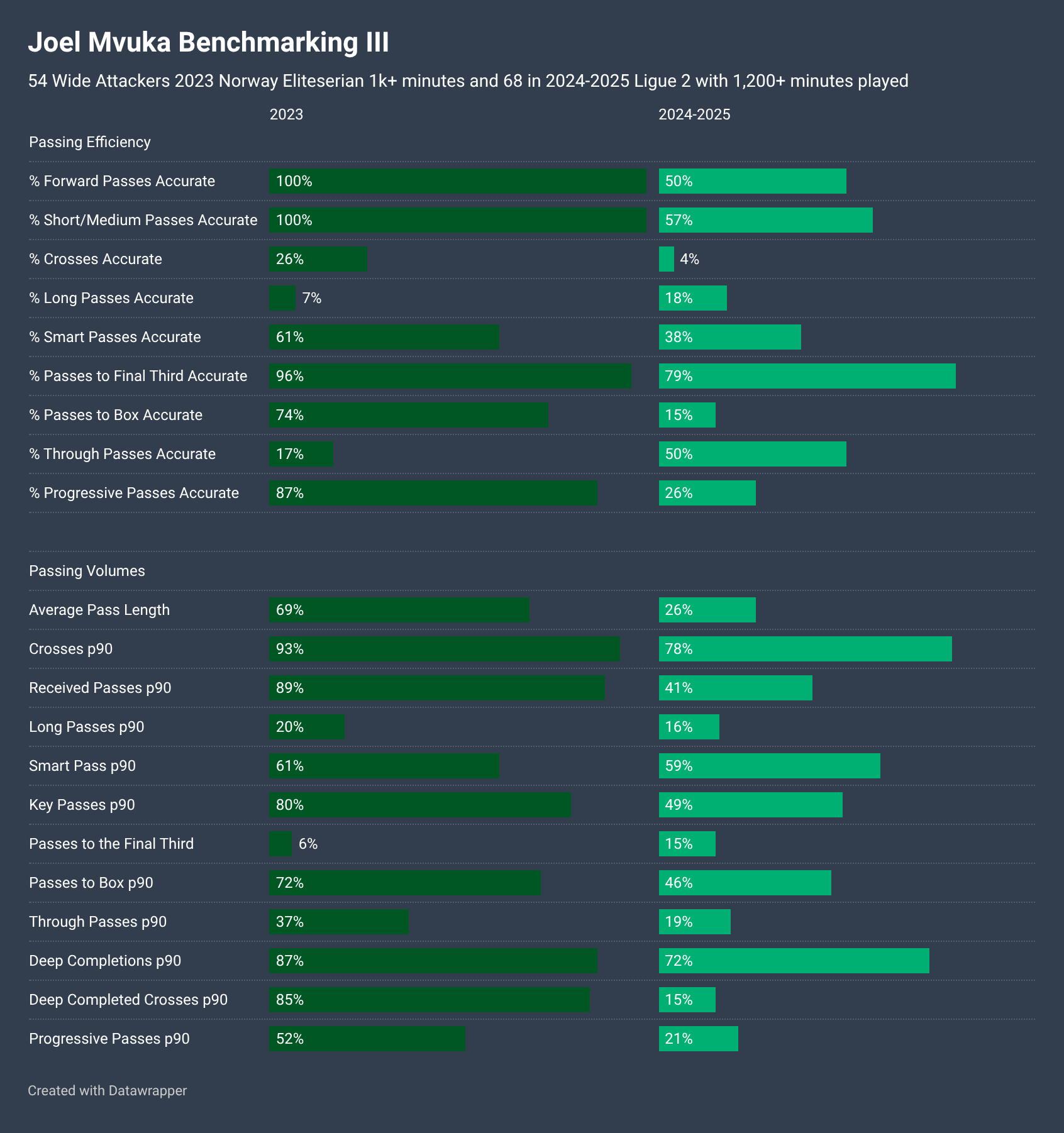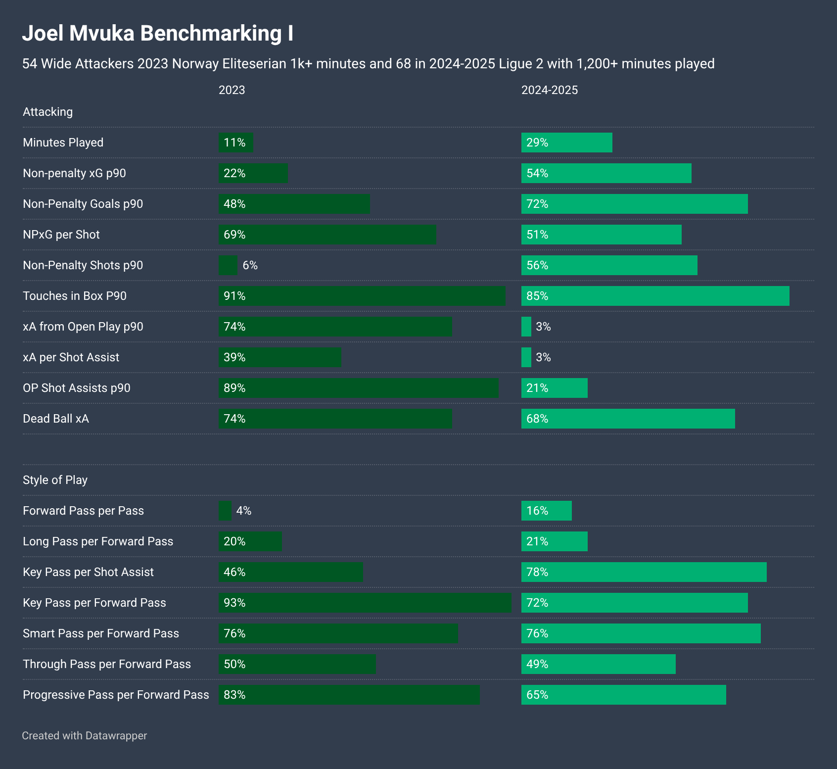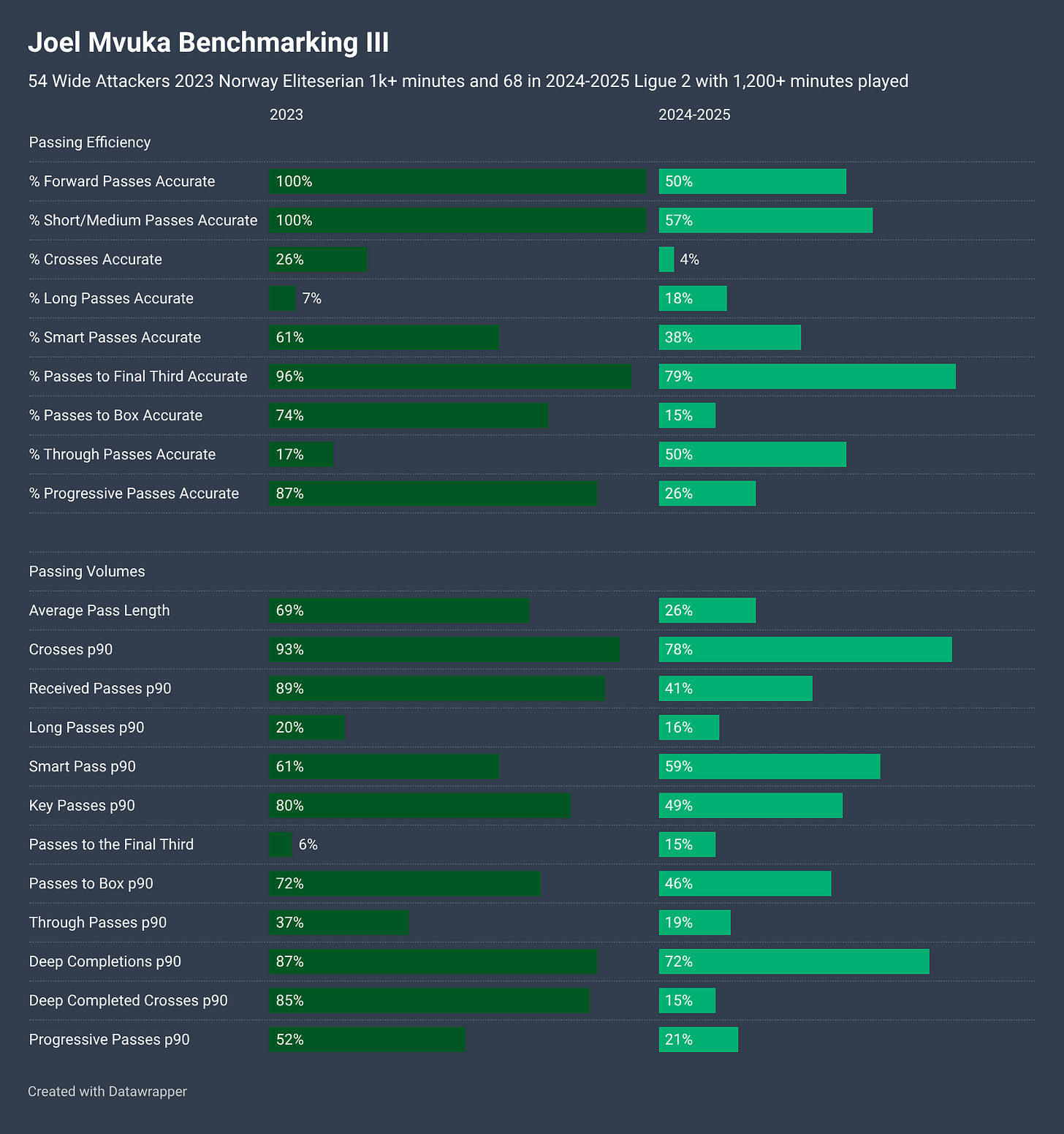 As always, this is important context when considering player rankings within this exercise and how much team factors can impact them. For example, while Mvuka’s xA from Open Play ranked in the 74th percentile in 2023 at Bodo/Glimt, they were by some distance the most dominant attacking team that season. His xA per Shot Assist ranking so low at 39th percentile reflects his 0.122 average xA per Shot Assist versus a team average xG per Shot of over 0.15.