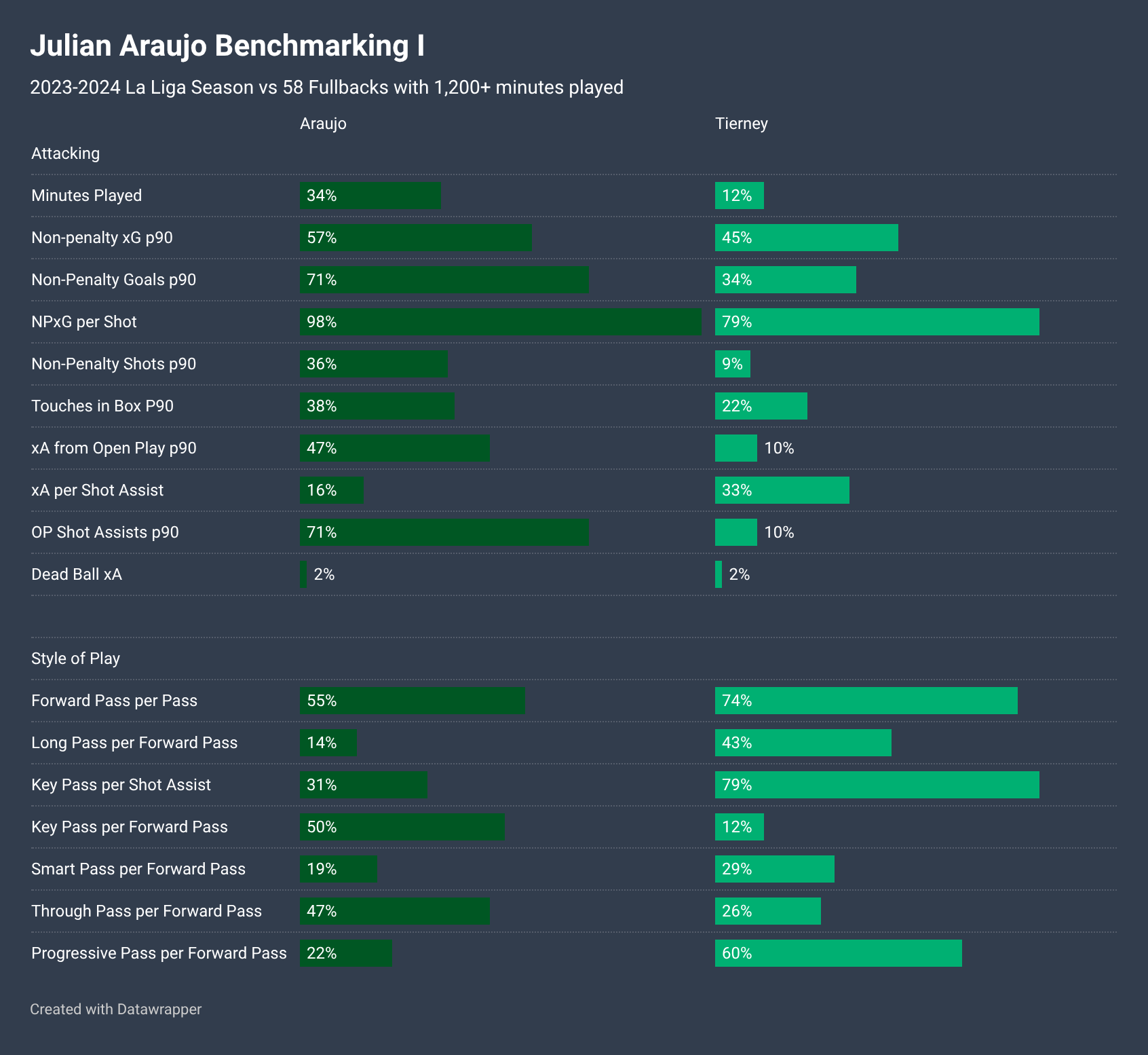 They were third in possession behind Barcelona and Real Madrid, and also the third highest passing rate (passes per minute of possession) behind Real Madrid and Atletico Madrid, and just ahead of Barcelona. Real Sociedad were directionally similar but more intense pressing out of possession while being less “ticky tacky” in possession. We can see these comparative elements evident within the style of play metrics, where Tierney’s passing profile is much more forward and progressive.