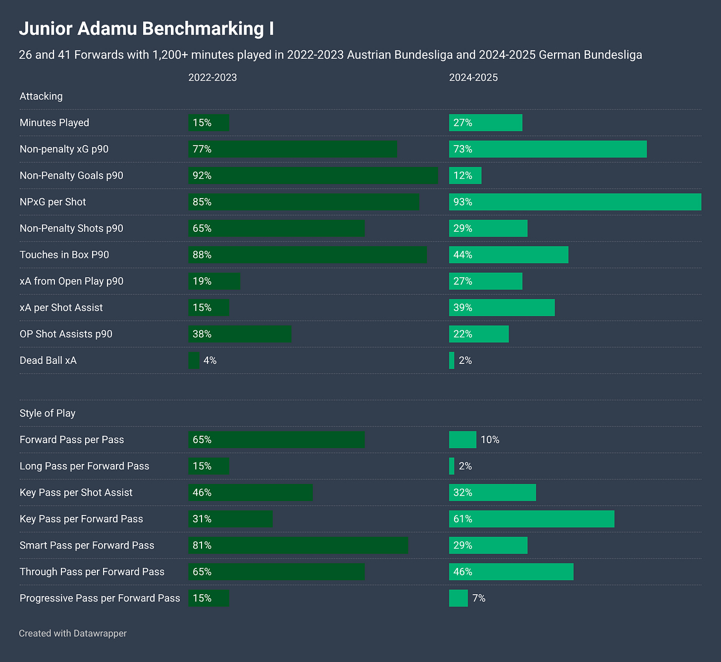Junior Adamu came up through the vaunted RB Salzburg system, where he arrived in July 2015. Following some time at Liefering in Austrian Bundesliga 2 in 2020-2021, he was put out on loan to St. Gallen in Switzerland for the 2nd half of the 2020-2021 season. He was then a rotation option at striker for RB Salzburg during the 2021-2022 and 2022-2023 seasons, playing 1,641 and 1,283 minutes.