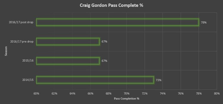 Gordon’s passing in the final Deila season was carried over until Rodgers dropped him. “Post drop” shows the improvement in pass accuracy, an increase of 11%. This is the equivalent to playing a new position – i.e. if a striker suddenly played a midfield role. The number of passes completed per game went up from 19.22 last season to 26.7 this. He is completing more passes, and passing more accurately.