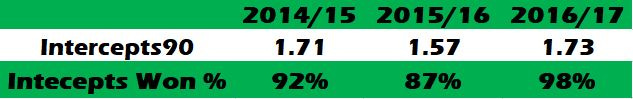 The number of intercepts is slightly up on his initial season but he is noticeably more successful executing them.