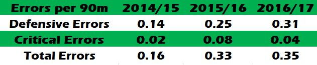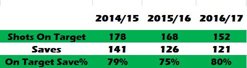 Gordon has racked up 33 key defensive saves over the season at 0.61 per 90m. This is lower than 2014/15 (0.85) and 2015/16 (0.73). However, there has been significantly less saves to make (14 less than last season) behind a more dominant defence than in recent seasons.