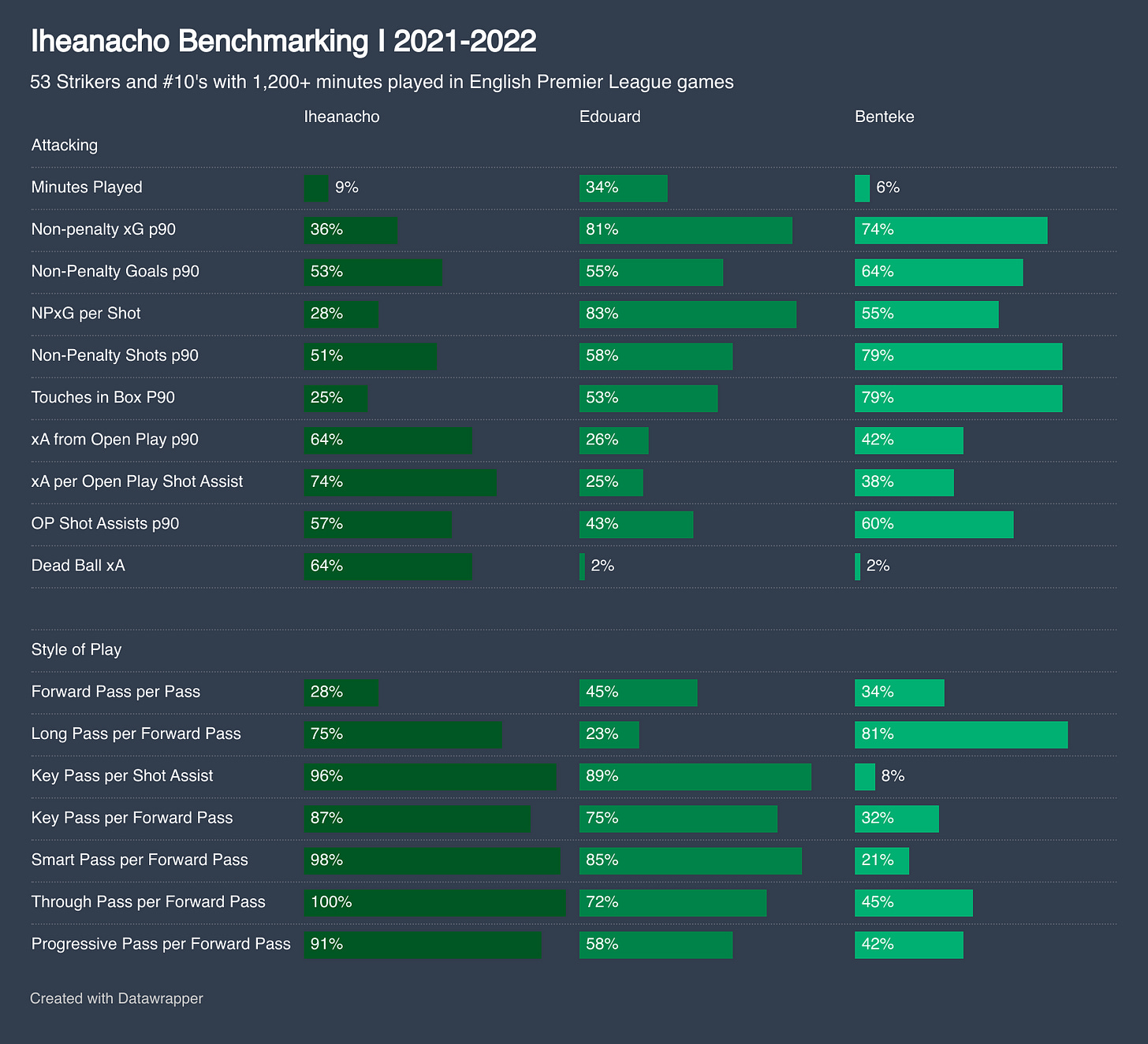 There were some similarities between Iheanacho and Edouard relative to the style of play section of metrics. Iheanacho’s profile was more that of a chance creator than a striker getting on the end of chances during the season.