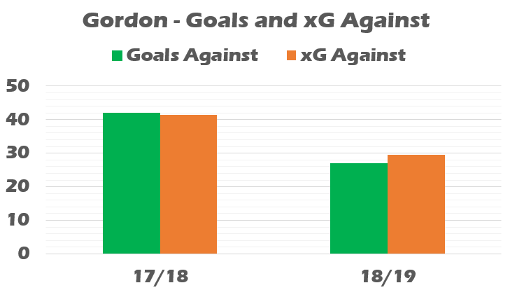 Last season Gordon conceded 42 goals. The xG models suggests he should have conceded 41.39. This season the respective numbers are 27 goals against and 29.49 xG against.