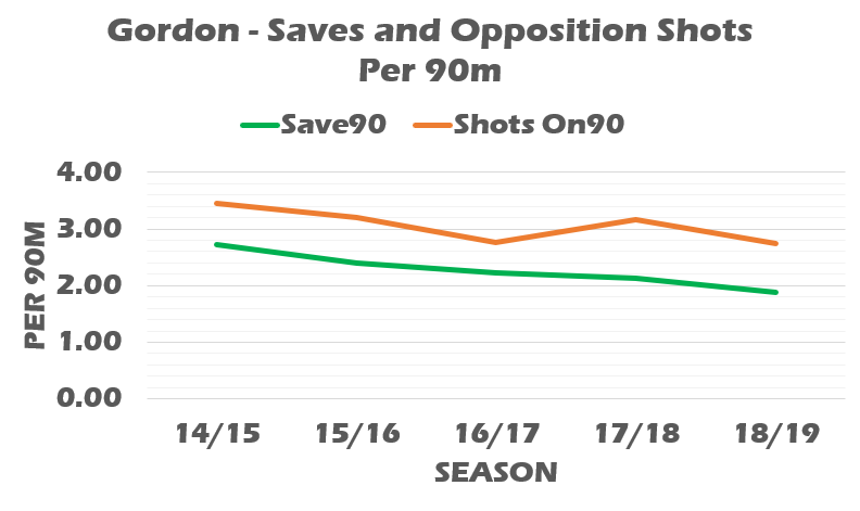 This shows that the number of saves Gordon is making per 90m is broadly in line with the number of shots the opposition are having on target. That is, he is consistent. And by the way, it is encouraging that the trend for opposition shots on target is reducing.