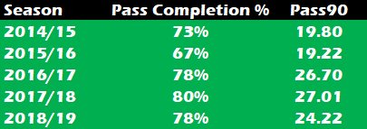 Additionally, the number of forward passes that take out opponents has dropped from 2.38 to 1.63 per 90m.