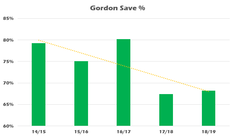 In the mainstream like Sky Sports the analysis of goalkeeping performance is restricted mainly to Save % - i.e. what percentage of shots on target are saved. Unfortunately, this tells you little about the quality of the goalkeeper. This is explained very well in this article by 11tegen11. I can illustrate further by showing you Gordon’s save % record over the last five seasons.