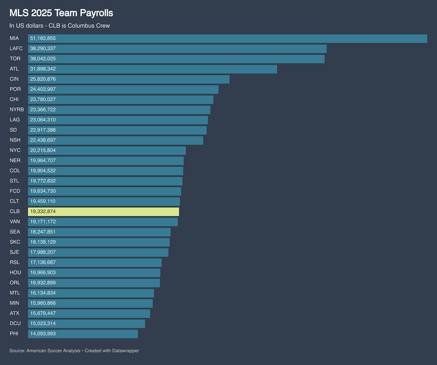 Let us begin with the boring Expected Trophies foundation of relative payrolls, where we see for the 2025 season Columbus (CLB) are 18th out of the 30 teams. Nancy arrived at Columbus for the 2023 season, with the team ranked 9th for 2022, 6th for 2023, and 18th for 2024.