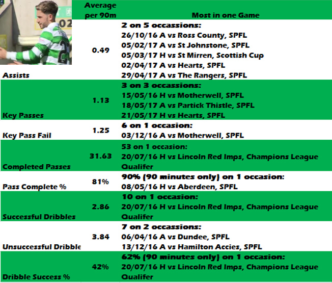 Roberts loves a risk! Both in terms of attempted key passes, and dribbles, he is unsuccessful more times than successful. However, no one could beat Roberts chance creation rate of 1.17 per 90m last season. Similarly, he was the master dribbler, averaging 2.92 successful dribbles last season. If you don’t ask, the answer is always no! Although the table above may hint at a tendency to being a “flat track bully” with the Lincoln Red Imps home game featuring heavily, as well as Scottish Cup ties against lower opposition, one key assist came in Astana. 0-1 down and without a shot at goal, he tenaciously won the ball on the right edge of the goal line and cut the ball back for Griffiths to score the vital away goal. That, and one assist in the Lincoln Red Imps match are his only European assists. Of 20 assists, only 7 have come at Celtic Park. Arguably his most effective game came away at Partick Thistle, where the team put on a show to win 5-0. As well as 2 goals from 4 shots, 3 on target, there was an assist from a penalty. He also created 3 chances for others from 6 attempts and provided 5 key passes. He led the team with 3 successful take dribbles from 6 attempts. Not his most important impact perhaps, but his most productive single match.