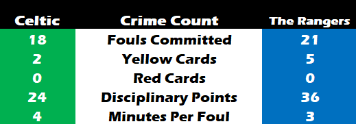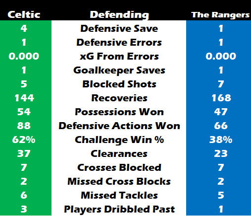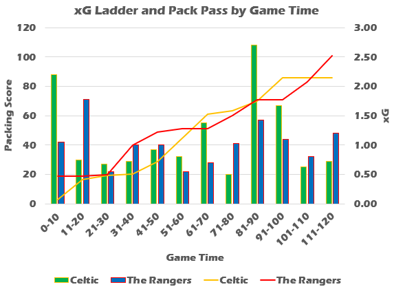 Both teams were able to pass through the opponent easily and so the Packing scores were high. The Rangers went man for man rather than defending space as well as deploying a high press. Meanwhile Celtic continued to press high while they could.