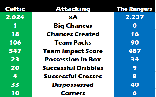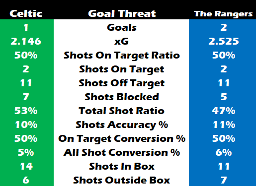 Celtic managed 14 shots in the box which is one of the higher totals of the season. However, few of them were clear cut and an average xG per shot of 0.1 is relatively poor. The Rangers average was 0.14.