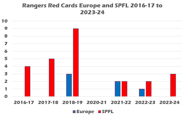The early SPFL Premiership version of The Rangers had a real discipline problem. 25 red cards in Europe and SPFL football in three seasons. Ryan Jack was sent off five times, Alfredo Morelos seven times.